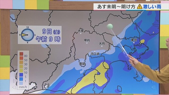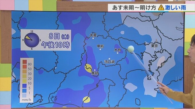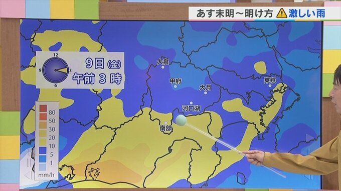 ところが、日付が変わってくるタイミング、特に黄色の土砂降り。南部周辺や、さらに富士五湖方面でもかかってくる予想となっています。
