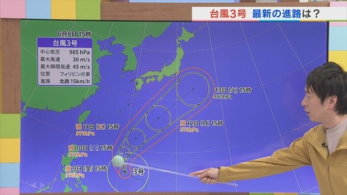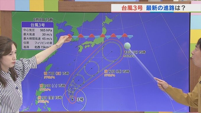 万が一、北の方向に進みますと、台風からの湿った空気がどんどん送り込まれまして、さらに梅雨前線があると、先週金曜日と同じようにまた大雨のおそれがあります。