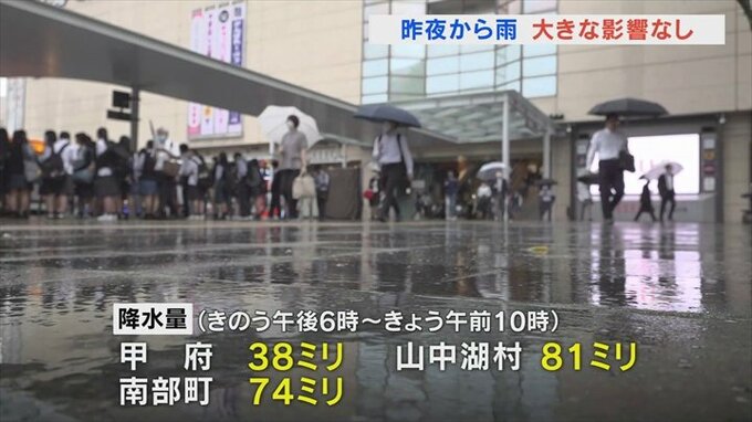 8日午後6時の降り始めから9日午前10時までの雨量は甲府で38mm、山中湖村で81mm、南部町で74mmなどとなっています。