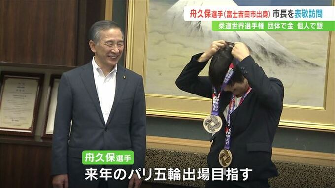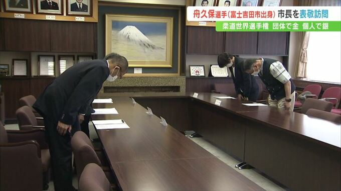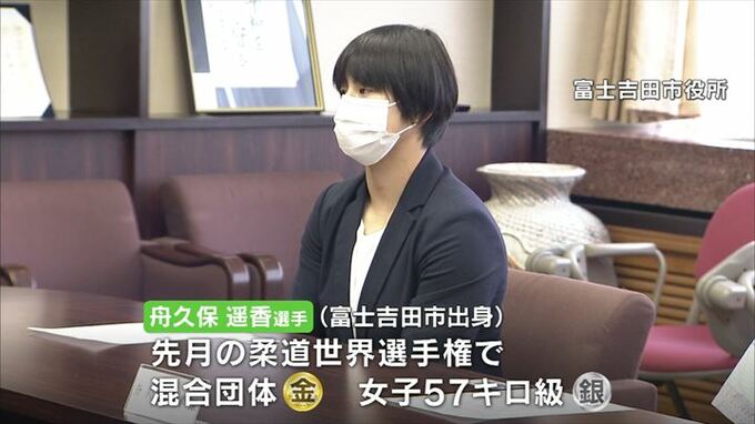 柔道の世界選手権で団体金メダル、個人で銀メダルを獲得した山梨県富士吉田市出身の舟久保遥香選手が市長を表敬訪問しました。