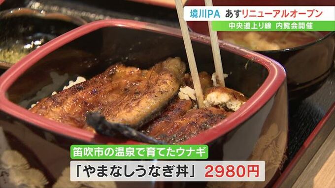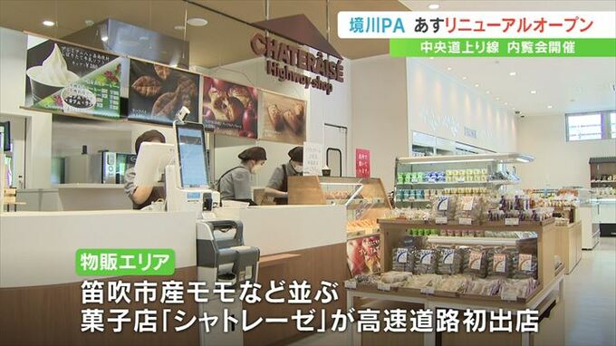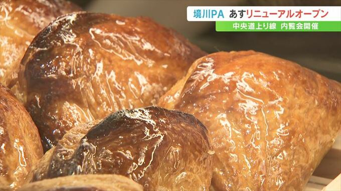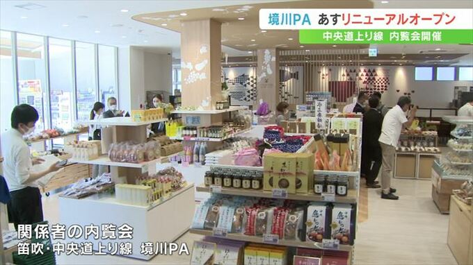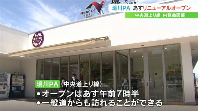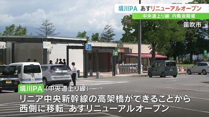山梨県の中央道 上り線の境川パーキングエリアが14日にリニューアルオープンするのを前に、13日に内覧会が開かれました。