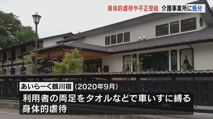 県によりますと、事業所は2020年9月 利用者1人の両足をタオルや手拭いで車いすに縛りつける身体的虐待をした他、車いすから転落を繰り返す別の利用者に対し、安全対策を講じずおととし4月顔などにけがをさせました。