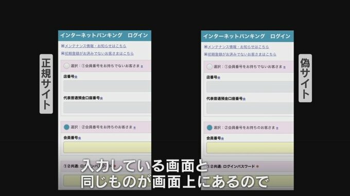 すると自身が利用するインターネットバンキングの公式サイトによく似た偽サイトのログイン画面が表示されたため、そのままIDやパスワードを入力したということです。