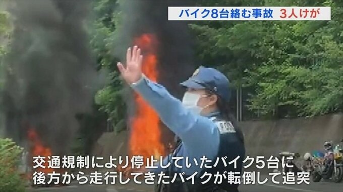 警察によりますと、事故による交通規制により、停止していたバイク5台に後ろから走ってきたバイクが転倒して追突、炎上したということです。