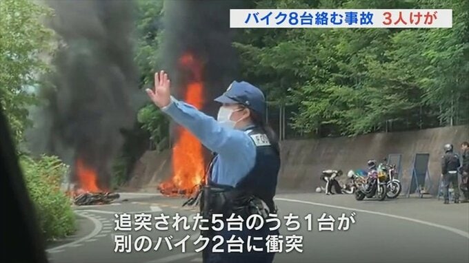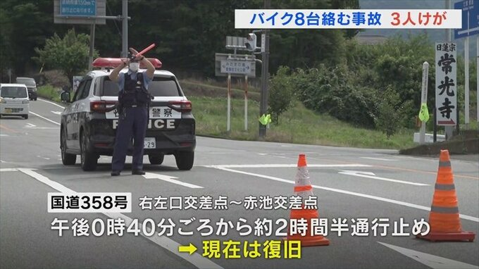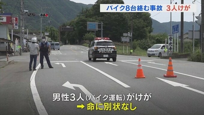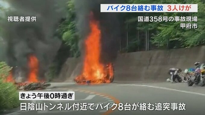 山梨県甲府市の国道358号で、バイク8台が絡む追突事故があり、3人がけがをしました。