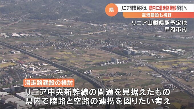 リニア中央新幹線の開通を見据えたもので、リニア山梨県駅とアクセスしやすい場所に滑走路を造ることで、県内で陸路と空路の連携を図りたいとしています。