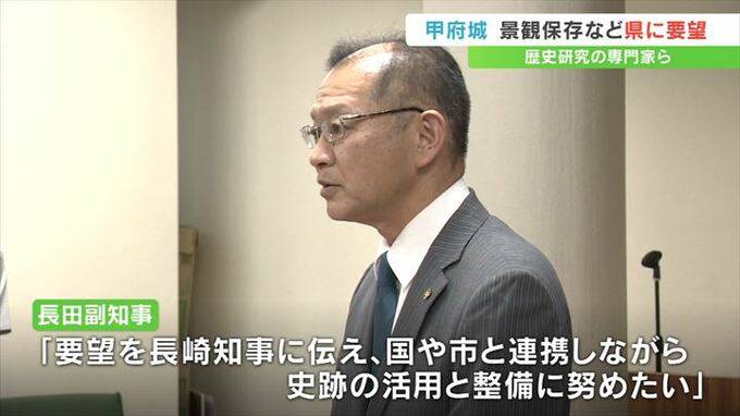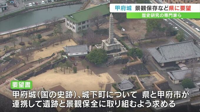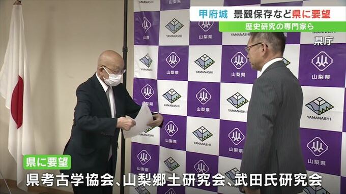 要望書では甲府城と、周辺の城下町の遺跡について県が甲府市と連携して埋蔵文化財の保護と歴史的な景観の保全に取り組むよう求めています。