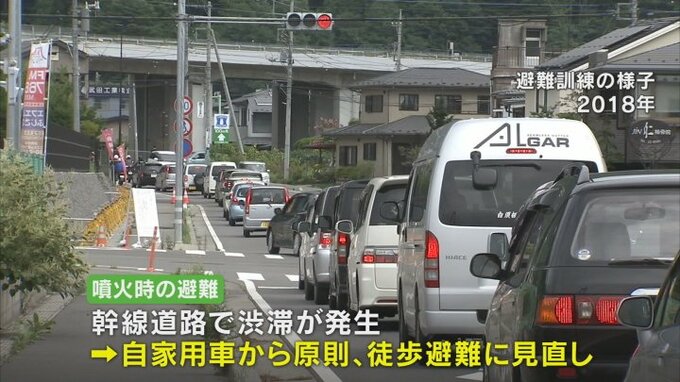 繰り返し行った避難訓練では幹線道路を中心に大規模な渋滞が発生し、渋滞による逃げ遅れを防ぐため、今年3月、一般住民は噴火後、自家用車ではなく原則徒歩で避難することに見直されました。