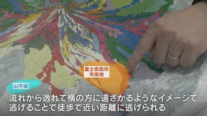 例えばこの辺にお住まいの方で溶岩流が来る場合は、下流の方に逃げるとどこまでも追いかけてくるので、流れから逸れて横の方に遠ざかるようなイメージで逃げることで、徒歩で近い距離に逃げられる。