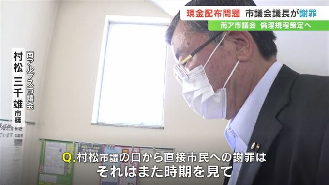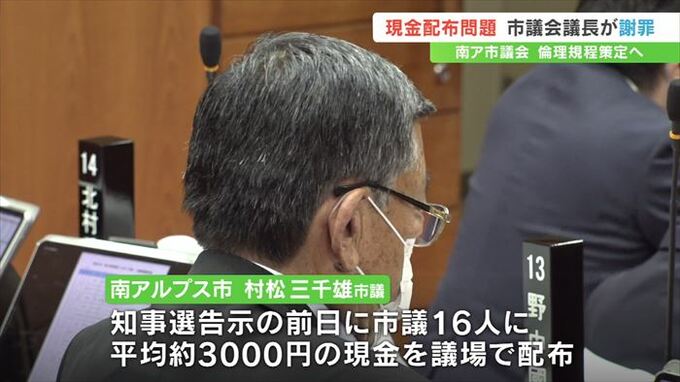 南アルプス市議会では、長崎知事を支援する「前進やまなしの会」の南アルプス支部代表である村松三千雄市議が、知事選告示の前の日に市議16人に1人平均3000円の現金を議場で配布したことが問題となっています。