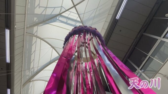 6月20日は約50人の生徒が参加して天の川をイメージしたピンクと紫の七夕飾りを作り、アーケードに取り付けました。