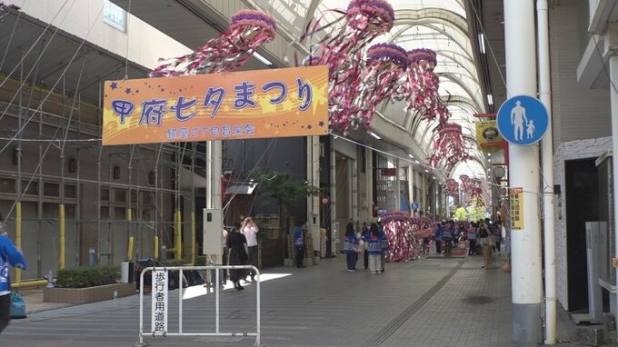 甲府市中心街で行なわれる「甲府七夕祭り」を盛り上げようと、地元の専門学校の生徒がアーケードに「天の川」を取り付けました。