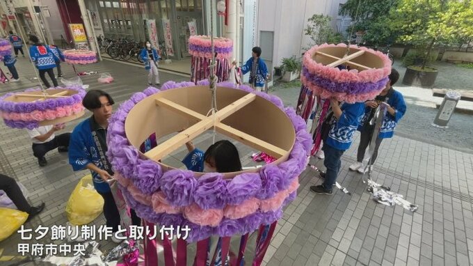 7月7日から始まる「甲府七夕祭り」に向け、飾りの取り付けを商店街の人たちと協力して行っています。
