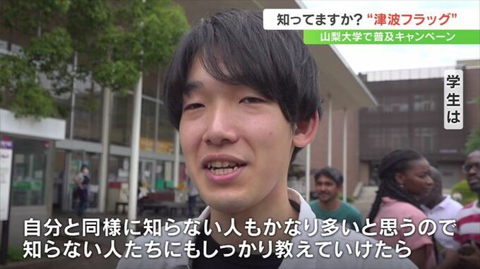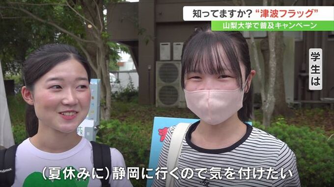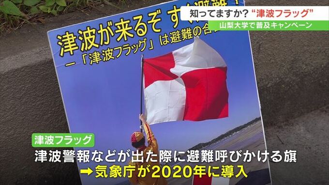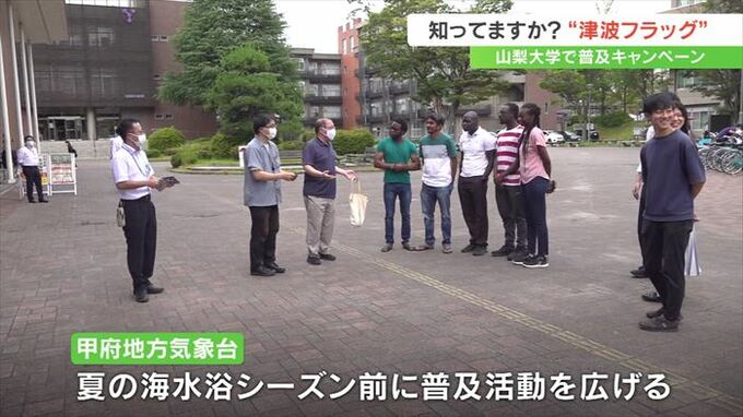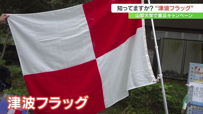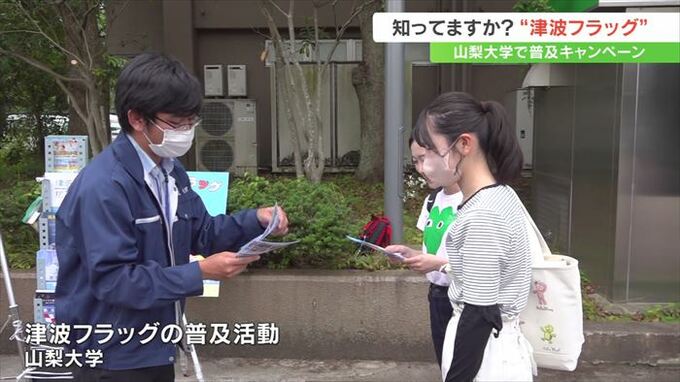 この津波フラッグを周知しようと、21日は甲府地方気象台の職員が山梨大学で学生らにチラシを配り、ライフセーバーが旗を振ったら海から離れて高い所へ逃げるよう呼びかけました。
