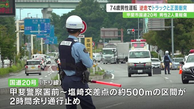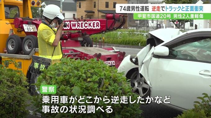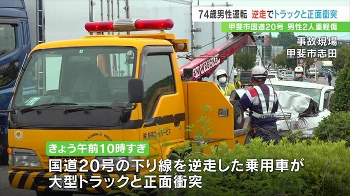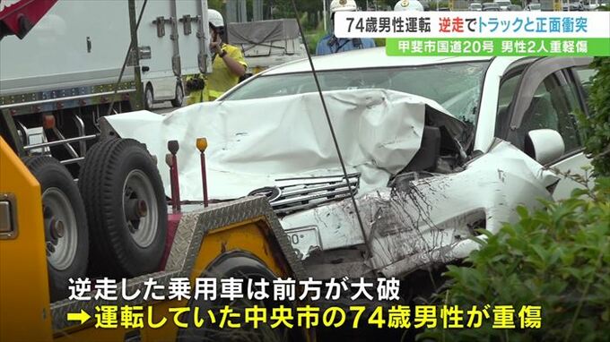 21日午前、山梨県甲斐市の国道20号の下り線を74歳の男性が運転する乗用車が逆走し、大型トラックと正面衝突しました。