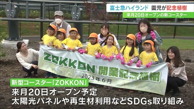 23日は山中湖村にある平野保育所の園児7人が、7月オープンする新型コースター「ZOKKON」の敷地内に木を植えました。