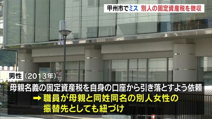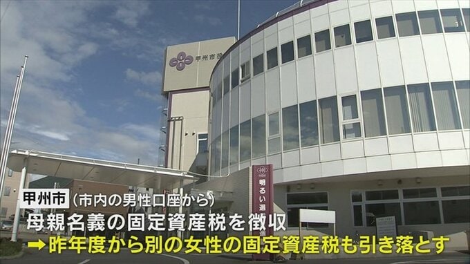 甲州市は市内の男性の口座から男性の母親名義の固定資産税を徴収していますが、昨年度から2年間、別の女性の固定資産税も引き落としていたと明らかにしました。