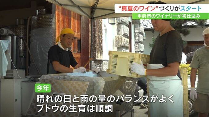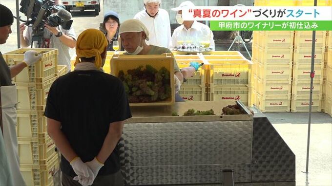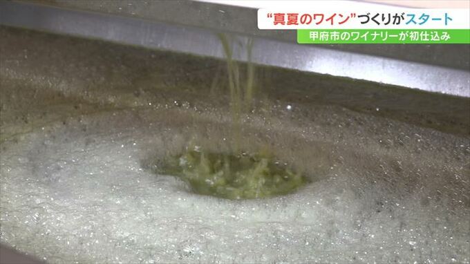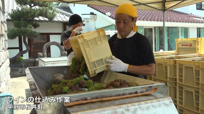 甲府市のワイナリーで、露地栽培のブドウを使ったワインの仕込み作業が行われました。