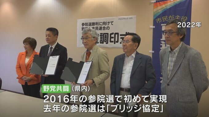 野党共闘は県内では2016年の参院選で初めて実現し、2022年の参議院選挙では立憲民主党と共産党の間を市民連合やまなしが取り持つ形での「ブリッジ協定」が行われました。