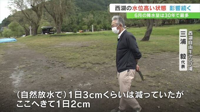 水位は未だ高い状態で湖畔のキャンプ場は営業への影響が続いています。