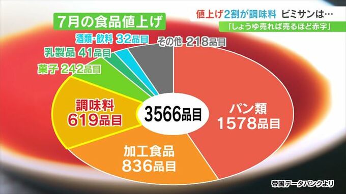 帝国データバンクによりますと、7月に値上げされる食品3566品目のうち、調味料は2割近くの619品目に上ります。