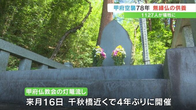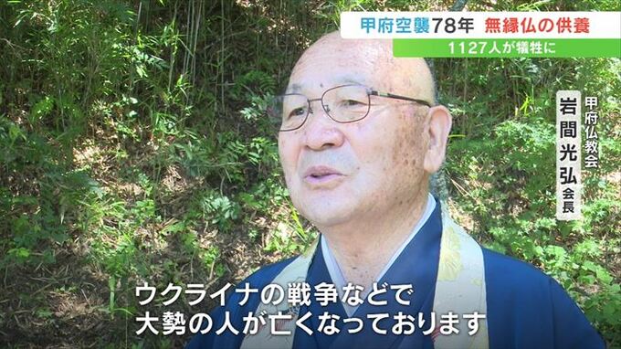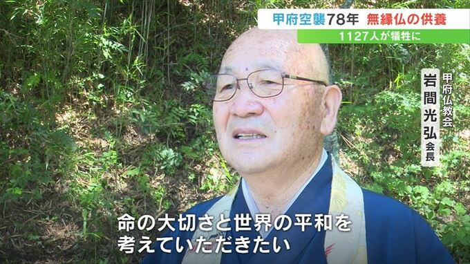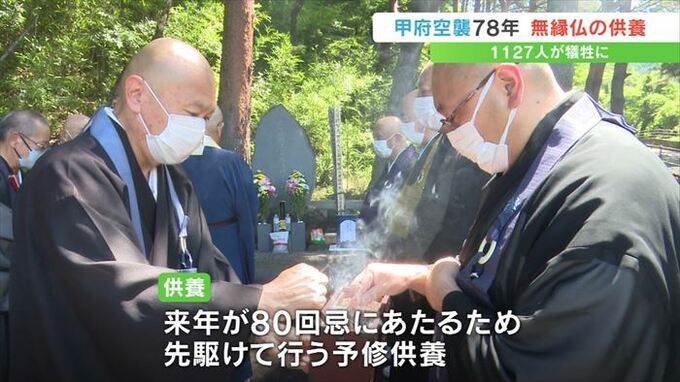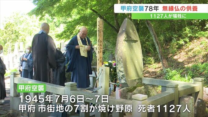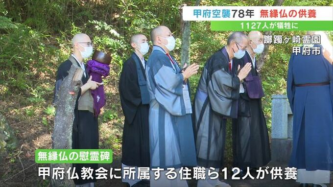 この日から78年を迎えた7月6日、甲府市の躑躅ヶ崎霊園には甲府仏教会に所属する寺の住職ら12人が集まり、無縁仏となった140人の遺骨が納められた慰霊碑の前で供養を行いました。