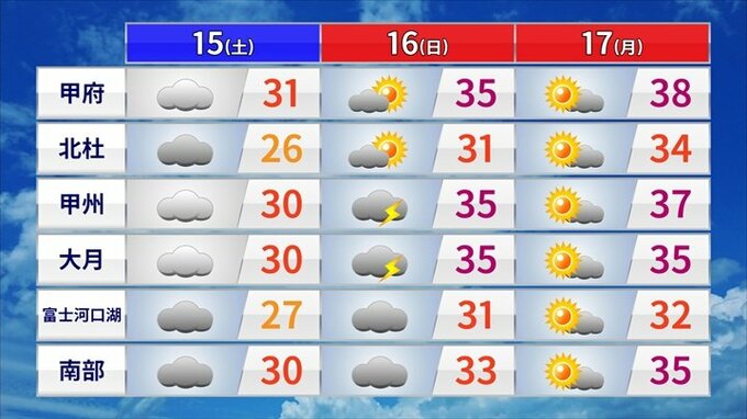 3連休の最終日が暑さのピークで、甲府はなんと38℃まで上がります。今年一番の暑さです。熱中症にはくれぐれもお気をつけください。