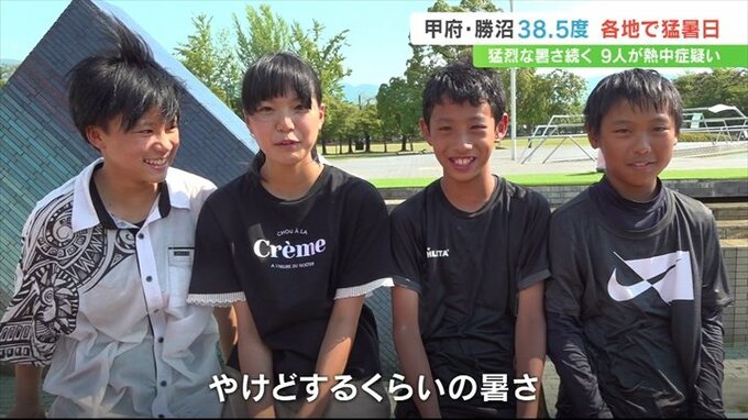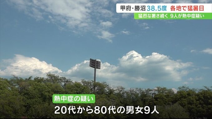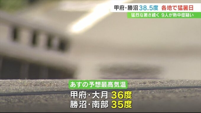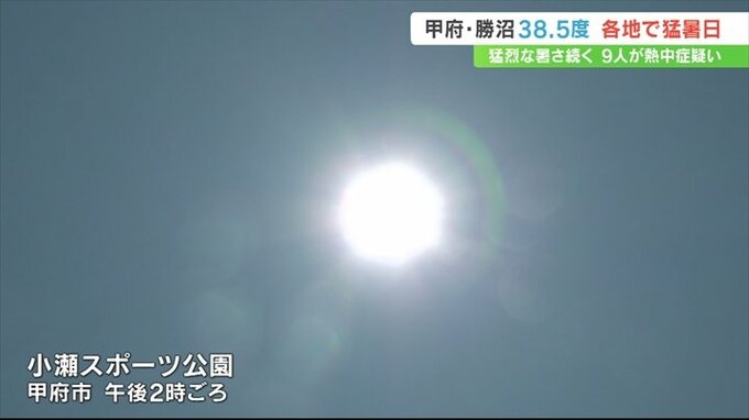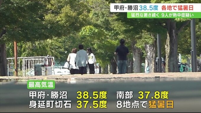 最高気温は甲府と勝沼が38.5℃、南部が37.8℃などと、観測10地点中8地点で35℃を超える猛暑日となりました。