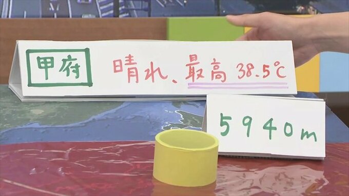 加えて、さらに山梨付近には上空さらに5940m付近まで背の高い高気圧に覆われていましたので、水曜日、甲府では晴れて最高気温が38.5℃まで上がりました。
