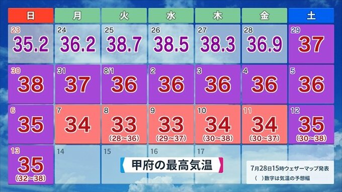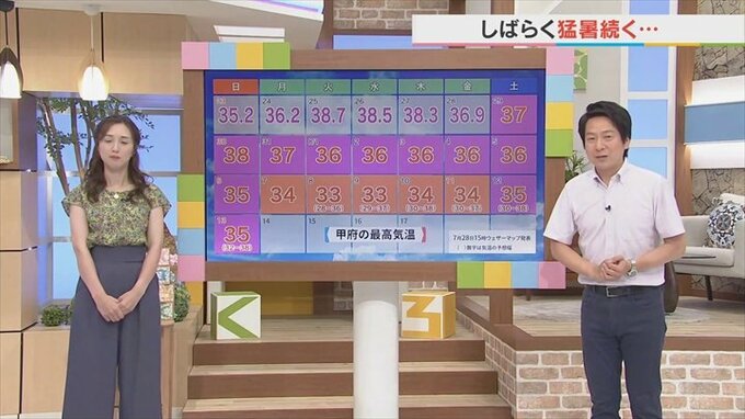 続く猛暑ですが、実はきょうで6日連続。来週に入っても甲府は猛暑日が続くと予想しています。その猛暑の終わりが見えてきそうなのが再来週ということになります。それでも1~2℃ですから、誤差です。