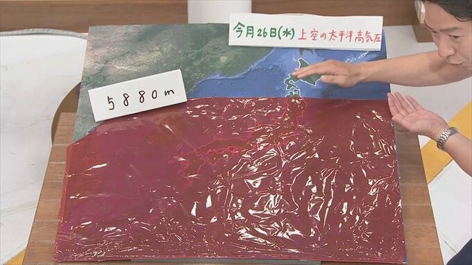 北日本まで上空約6km太平洋高気圧に覆われていて、そうなると何が起こるかというと、高気圧というのは下降気流なので、グーッと空気が下に下がっていって、要は熱が溜まりやすい状況となるんです。ですから、雲もできにくいんです。