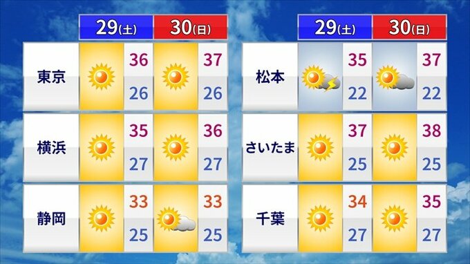 こちらも晴れて猛暑のところが多くなる見通しです。ですから、近県にお出かけされる方は、帽子や日傘など日焼け対策をしていただいて、水分補給も忘れずにお願いします。