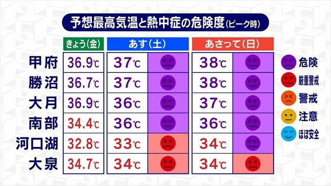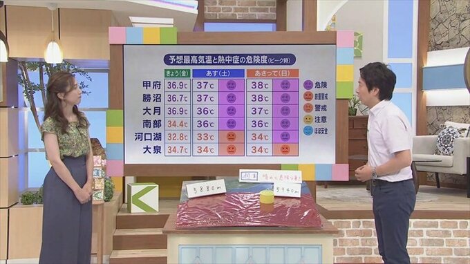 あすは熱中症警戒アラートも発表されていますので、ちょっと要注意となりそうなんですが、あさっての方が河口湖、標高の高いところでも一番上の危険レベルです。こまめに水分&塩分補給を摂っていただきたいです。