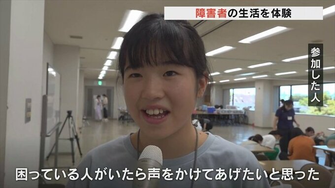 そして車いすに乗って砂利道などをイメージしたコースを通ったほか、アイマスクをつけて白杖を持って歩くなど障害がある人の生活を体験しました。