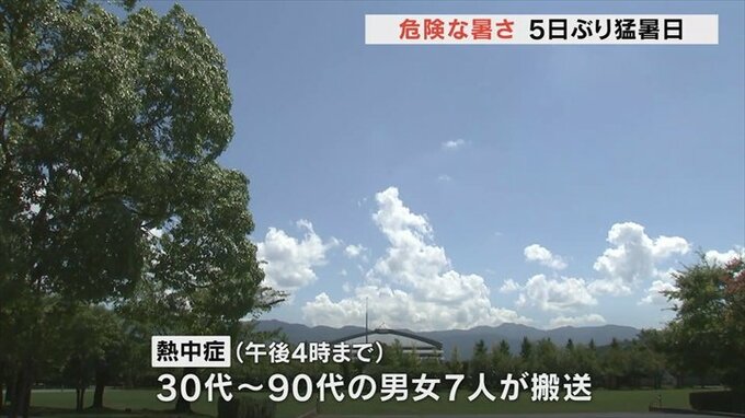 消防によりますとこの暑さで午後4時までに30代~90代の男女7人が熱中症とみられる症状で病院に運ばれました。