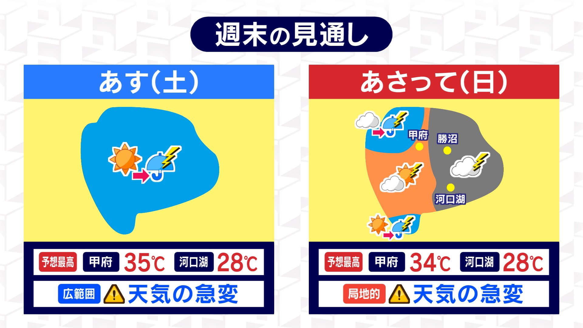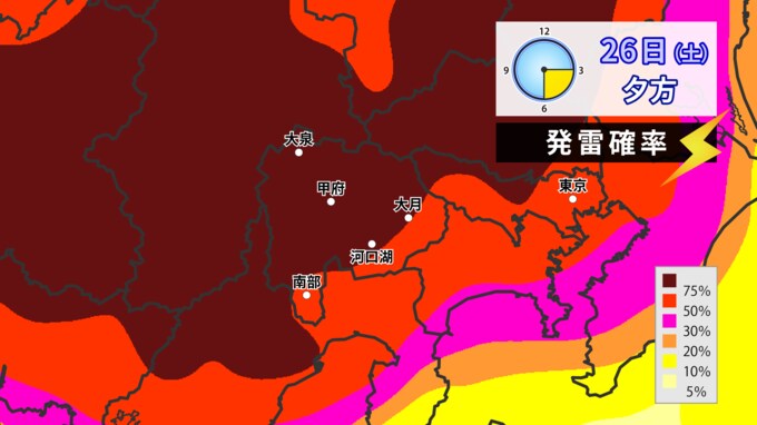 週末の見通しですが、山梨県はあす26日の午後は山沿いだけでなく盆地に関しても天気急変の恐れがありますので、外出の際は傘が必要ということになりそうです。