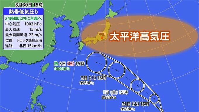 変わらずこの北西方向に進むということで、今のところ本州付近からは遠ざかっていく予想となっていますが、これがなぜかというと、理由は太平洋高気圧です。