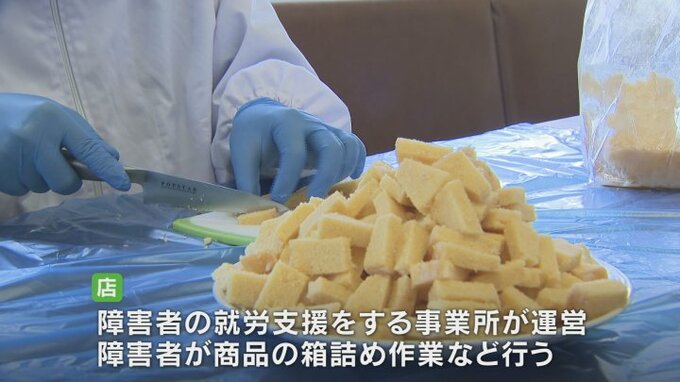 また店を運営するのは、障害者の就労支援などを行う甲斐市の事業所で、障害者がバウムクーヘンを試食用にカットしたり、商品の箱詰めなどを行うということです。