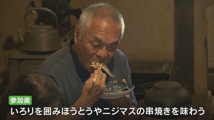 ツアーの参加者は、北杜市須玉町の古民家を改装した民宿でいろりを囲み、地元野菜をふんだんに使ったほうとうやニジマスの串焼きなどを味わいました。