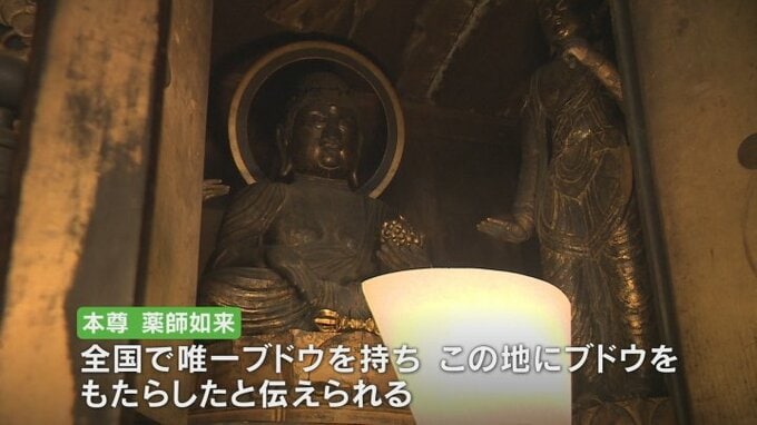 本尊の薬師如来は全国で唯一、ブドウを手に持っていて、この地にブドウをもたらしたと伝えられています。