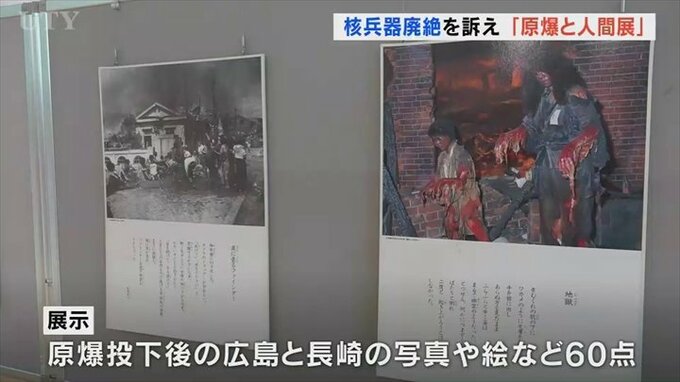 会場には原爆投下後の広島と長崎の悲惨な状況を伝える写真や絵など、60点が展示されています。