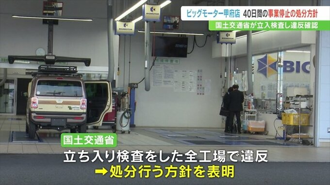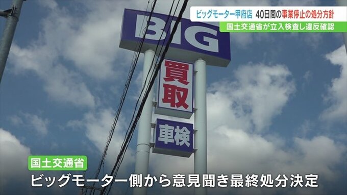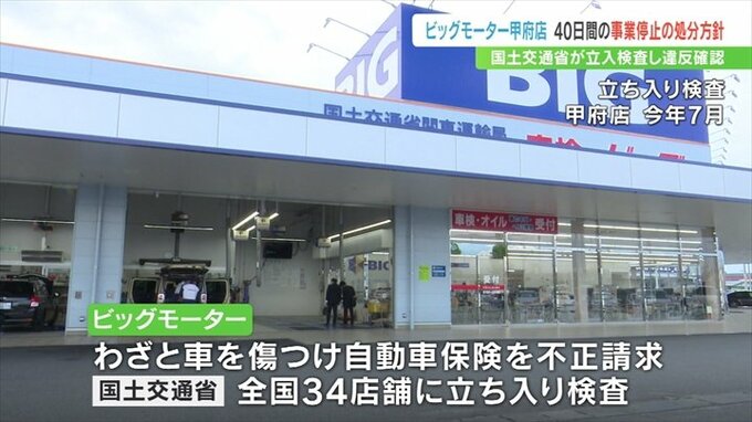 ビッグモーターによる保険金の不正請求問題で、国土交通省は甲府店でも違反があったとして、40日間の事業停止などの処分を出す方針を明らかにしました。