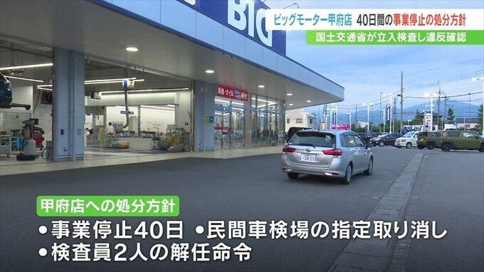 このうち甲府店は事業停止40日と民間車検場の指定の取り消し、さらに検査員2人の解任命令の処分となる見通しです。