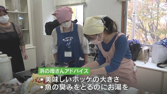 浜の母さんたちはおいしいホッケの大きさや魚の臭みを取るためにまずお湯をかけることなどをアドバイスしました。