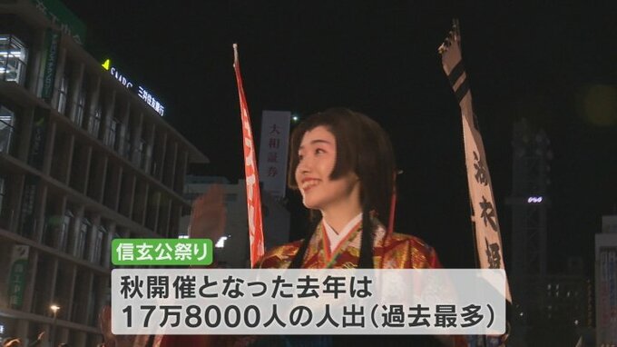 信玄公祭りは、秋開催となった2022年は過去最多の17万8000人を動員していて、2023年はグルメコーナーが充実していることから、実行委員会は2022年を上回る人出を見込んでいます。