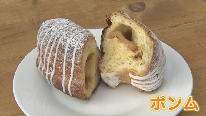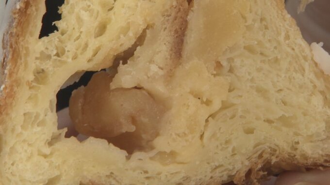 薄く切った一切れでも、かなり重量感があります。ケーキクラムに使われているパンは、リンゴのシロップやクリームをたっぷり吸って、しっとりとしています。パンが生まれ変わったとは思えない、新たなおいしさを感じます。