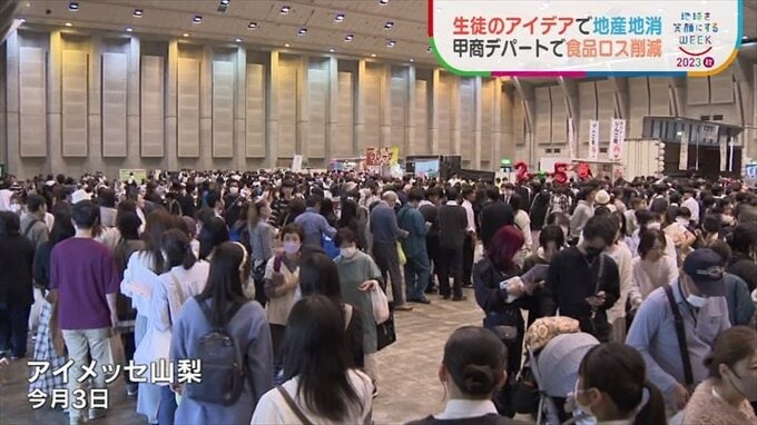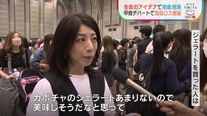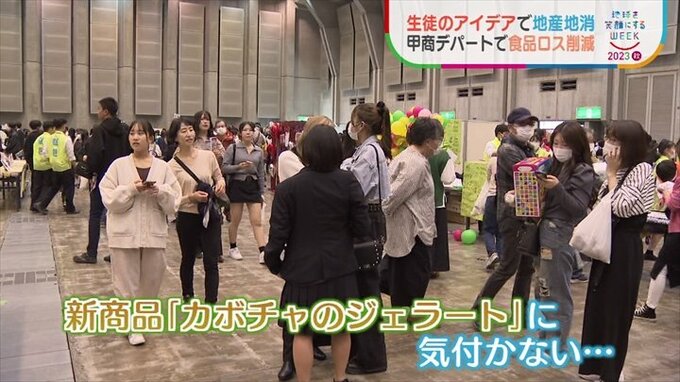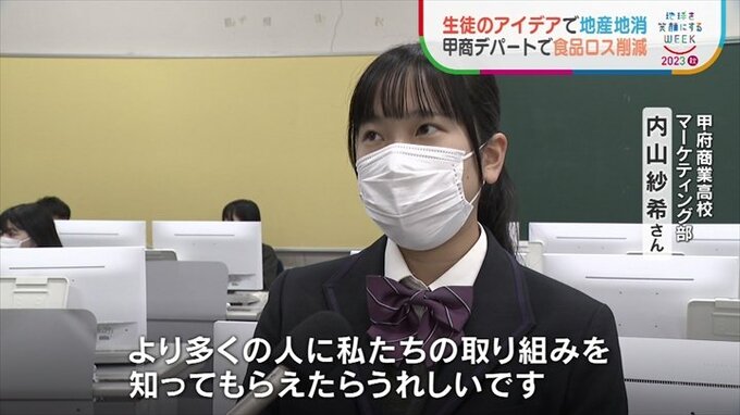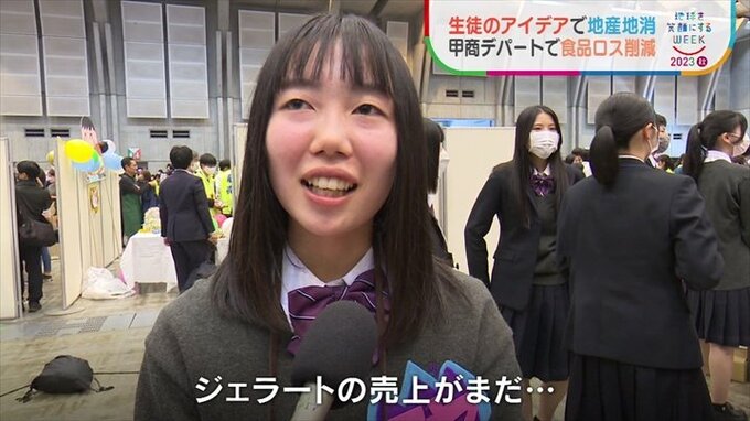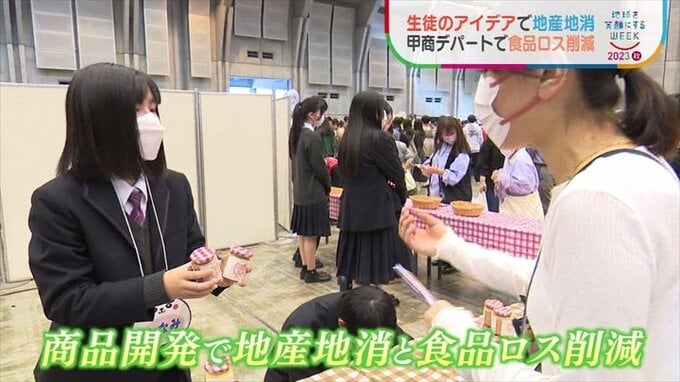 自分たちで考えた商品を通じて地産地消や食品ロスの削減を伝える生徒たち。