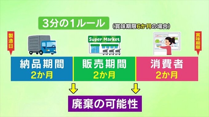 次の3分の1は消費者に販売する期間で、期間内に納品や販売ができなかった商品は食べられるのに廃棄されてしまう可能性があるというものです。
