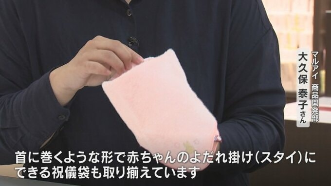 首に巻くような形で赤ちゃんのよだれ掛け(スタイ)にできる祝儀袋も取り揃えています。