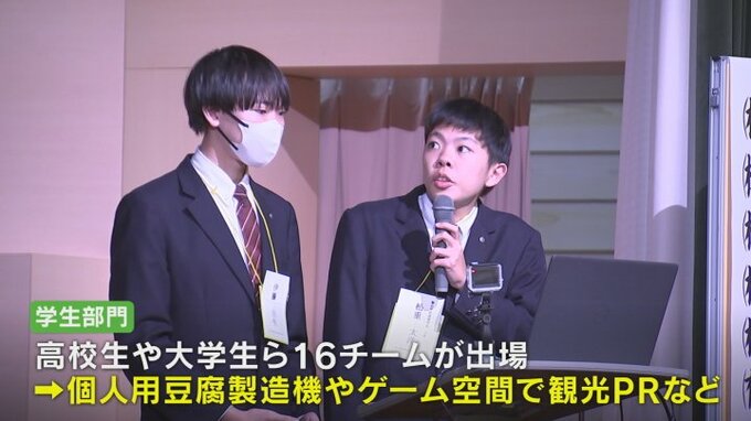 このうち学生部門には、県内の高校生や大学生でつくる16チームが出場し、個人用の豆腐製造機やゲーム空間で山梨の観光PRをするなど常識にとらわれないユニークな発想が次々飛び出しました。